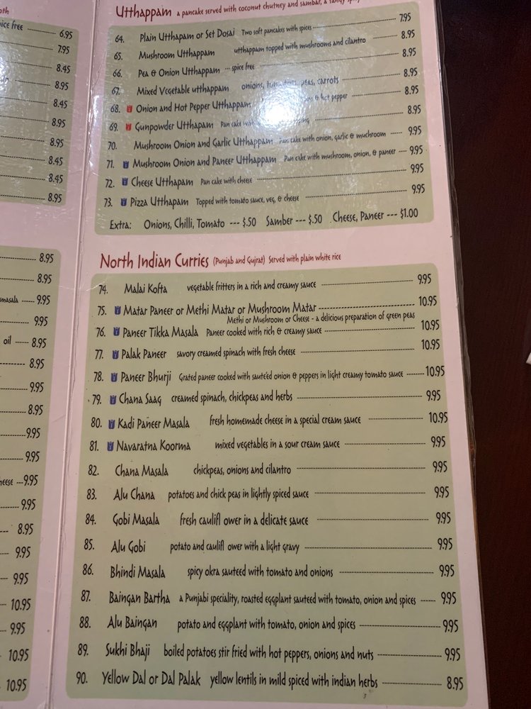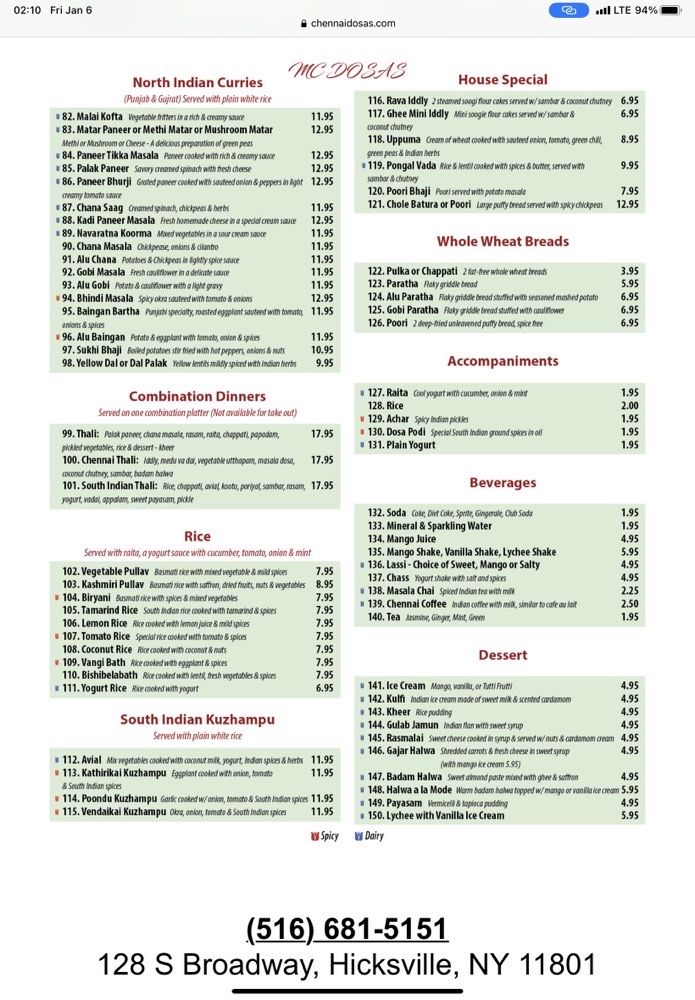 Chennai Dosas, a vegetarian Indian restaurant in Hicksville, NY, offers a diverse menu with authentic South Indian cuisine. The extensive list of Chennai appetizers includes traditional favorites like iddly, vadai, and samosas. The Gobi Manchurian and Chili Paneer are enticing options for those looking for a unique spin on Indian flavors. The dosas, particularly the Chennai rava masala dosa, are lauded for their crispy texture and flavorful fillings. The accompaniments like raita and dosa podi complement the dishes well. Customers praise the efficient service and generous portions at Chennai Dosas. With a variety of vegan and vegetarian options, this restaurant caters to those with dietary restrictions. The vibrant ambiance and friendly staff create a welcoming dining experience. Don't miss out on the authentic South Indian cuisine at Chennai Dosas - a true gem in the heart of Hicksville.